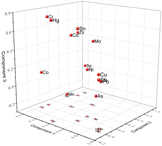 The dissolved and sediment-associated pollutants in surface water can be derived from natural and/or anthropogenic sources. SCSs contamination represents historically polluted deposits, and the result may be influenced by human disturbances, such as dredging and engineering construction. To further evaluate the anthropogenic sources of the pollutants in the SSs and SCSs in the LRB, PCA was conducted. The data for the anthropogenic metals were standardized prior to analysis to account for differences in the units of the parameters. The Kaiser–Meyer–Olkin (KMO) test and Bartlett sphericity test were implemented on the pollutants to determine the applicability of the data to the PCA [62]. In this study, the KMO value of the 14 metals was 0.685 and significance was defined as the 99% probability level (p < 0.001). Four components were extracted and the cumulative variance contribution rate was 78.398% (Table S12, Figure 2 and Figure 3).