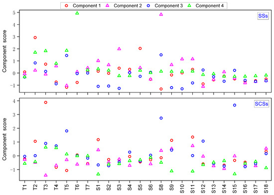 Variations in the component scores derived from the PCA of the suspended solids (SSs) and surficial channel sediments (SCSs).