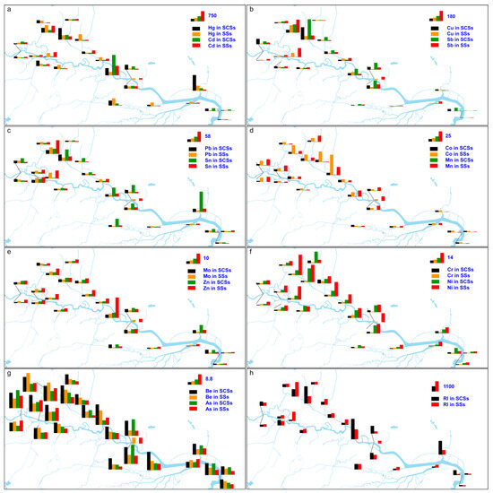 Potential ecological risk for metals in suspended solids (SSs) and surficial channel sediments (SCSs) from the LRB. (a) Hg and Cd; (b) Cu and Sb; (c) Pb and Sn; (d) Co and Mn; (e) Mo and Zn; (f) Cr and Ni; (g) Be and As; (h) potential ecological risk index (RI).