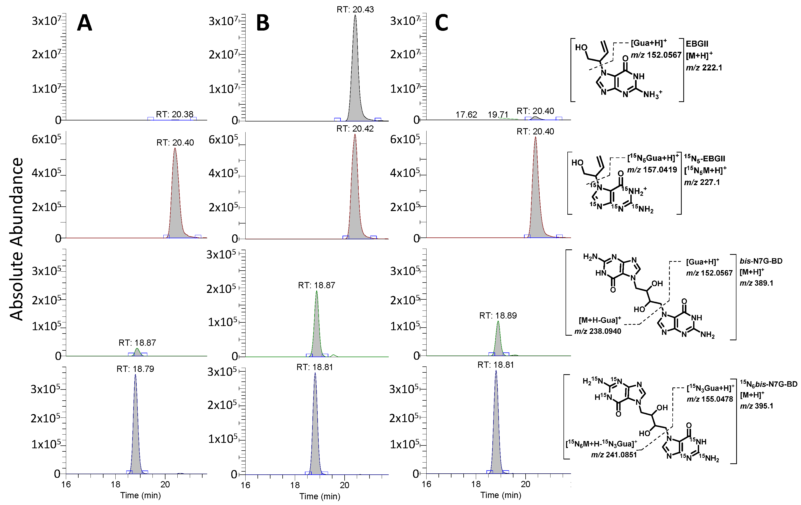 bis-N7G-BD were calculated by the comparison of area ratios of peaks corresponding to the analytes and known amounts of internal standards, which were added prior to neutral thermal hydrolysis. Sample concentrations of EB-GII and