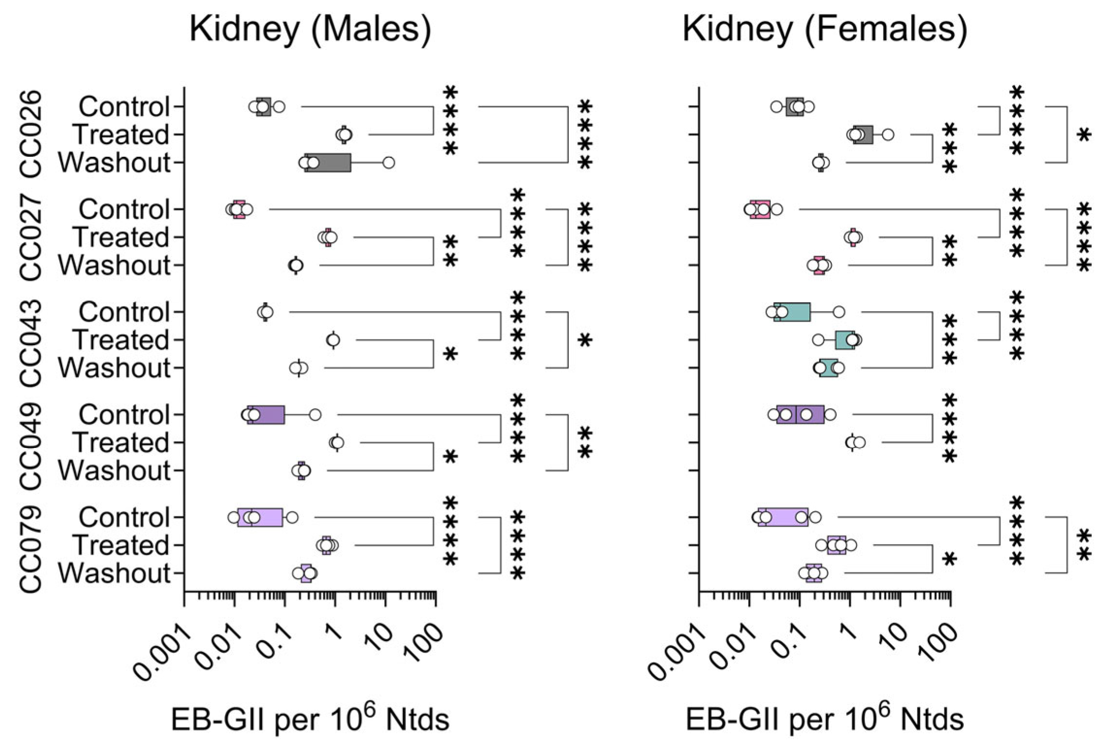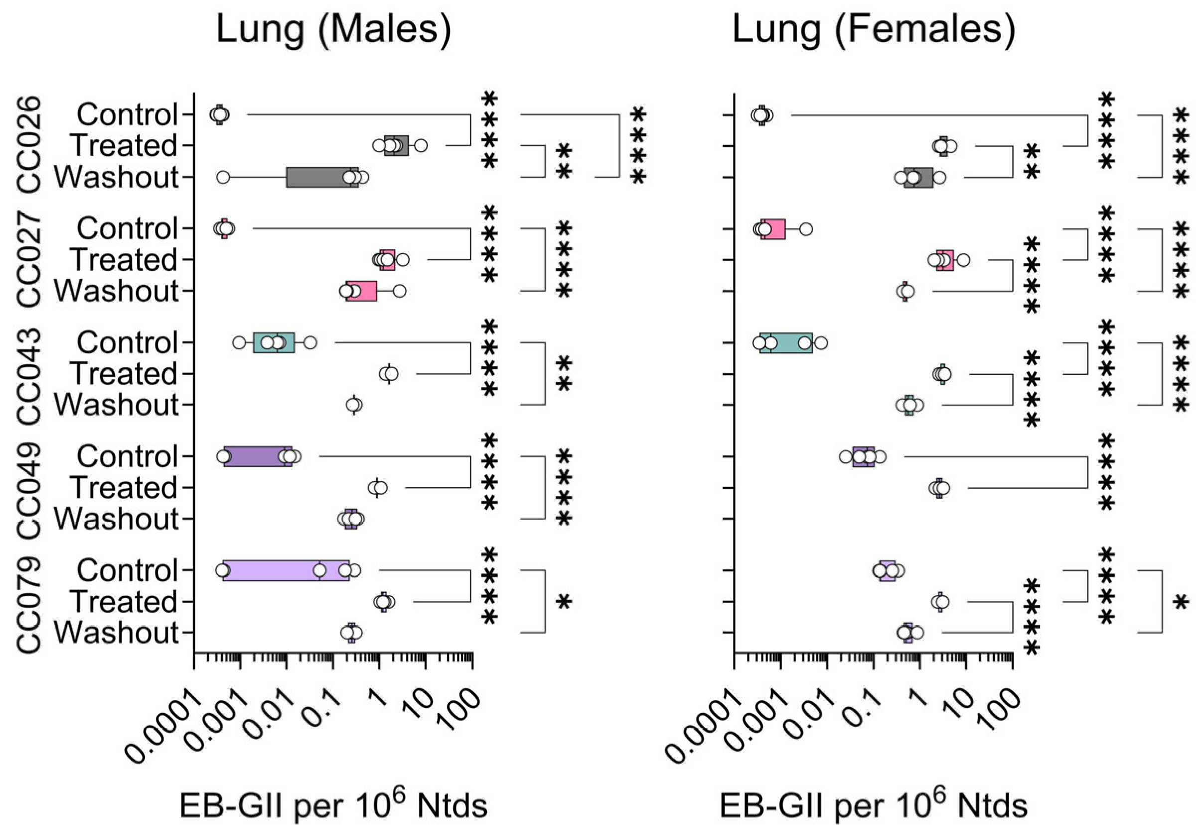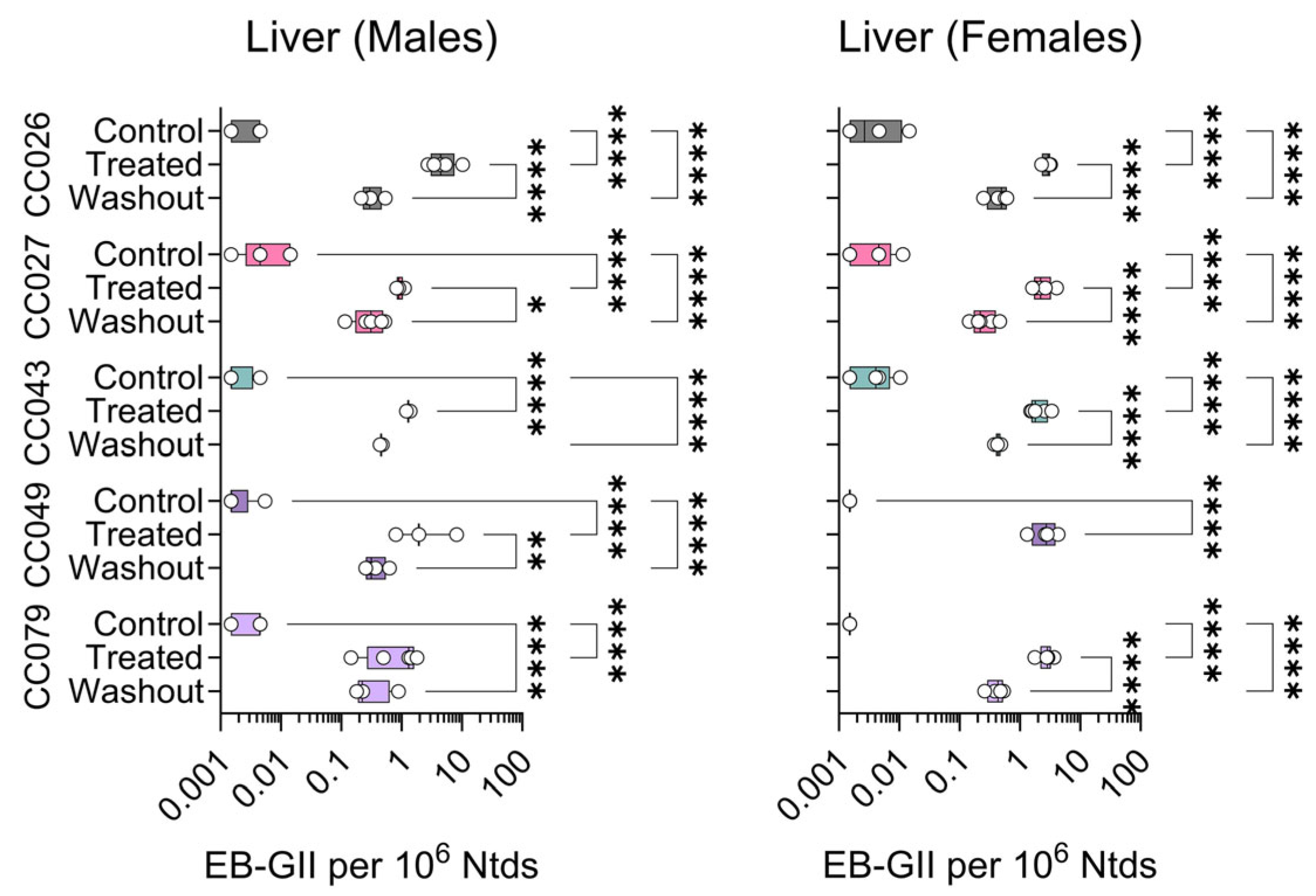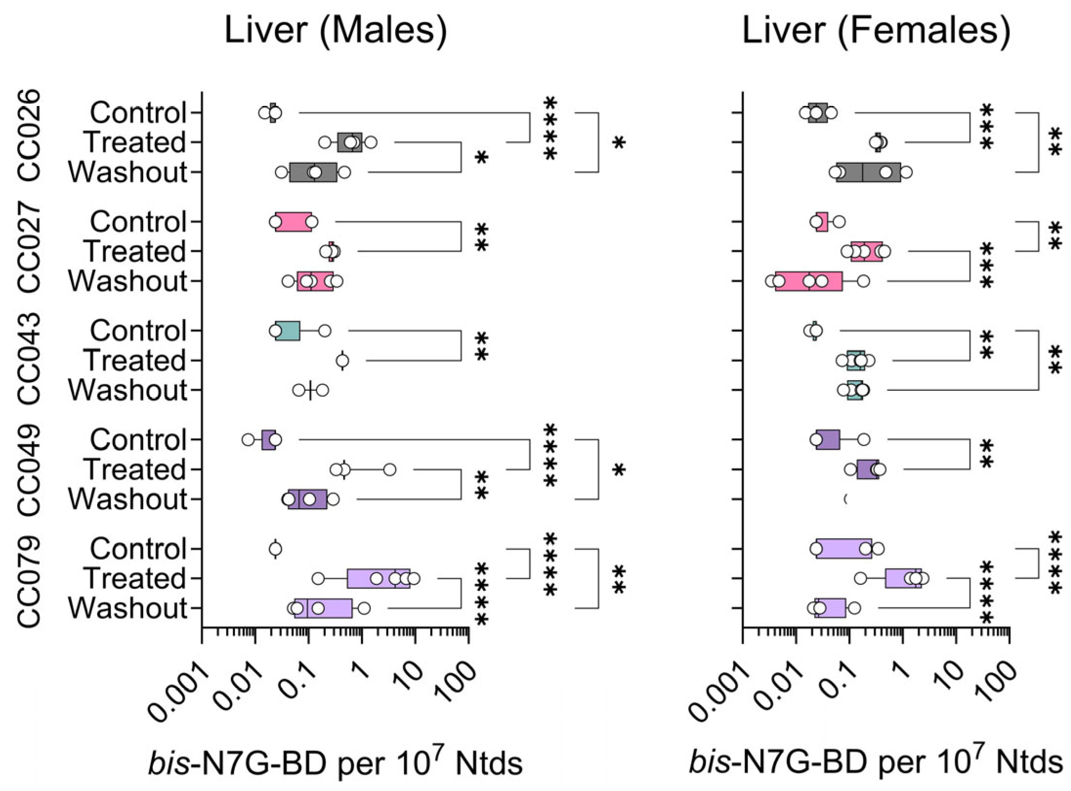 Figure 3). In the kidney, adduct levels were significantly increased with treatment in both sexes and all strains. Treatment effects were significant only in female CC026, CC027, and CC049 mice. The washout effect was significant in most strains in both sexes (