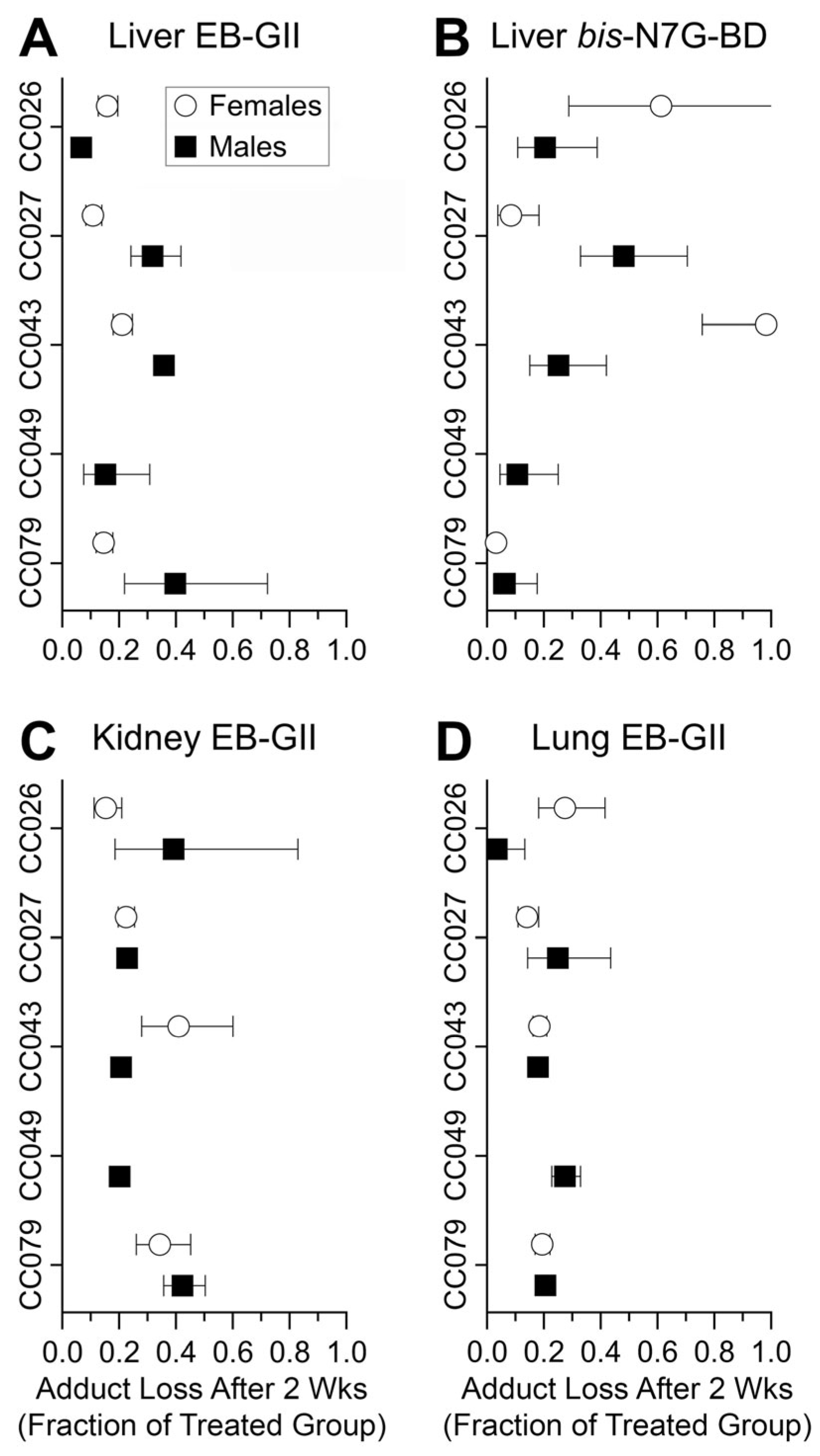 bis-N7G-BD in females from CC043—where minimal loss of this adduct was observed even after 2 weeks of recovery (