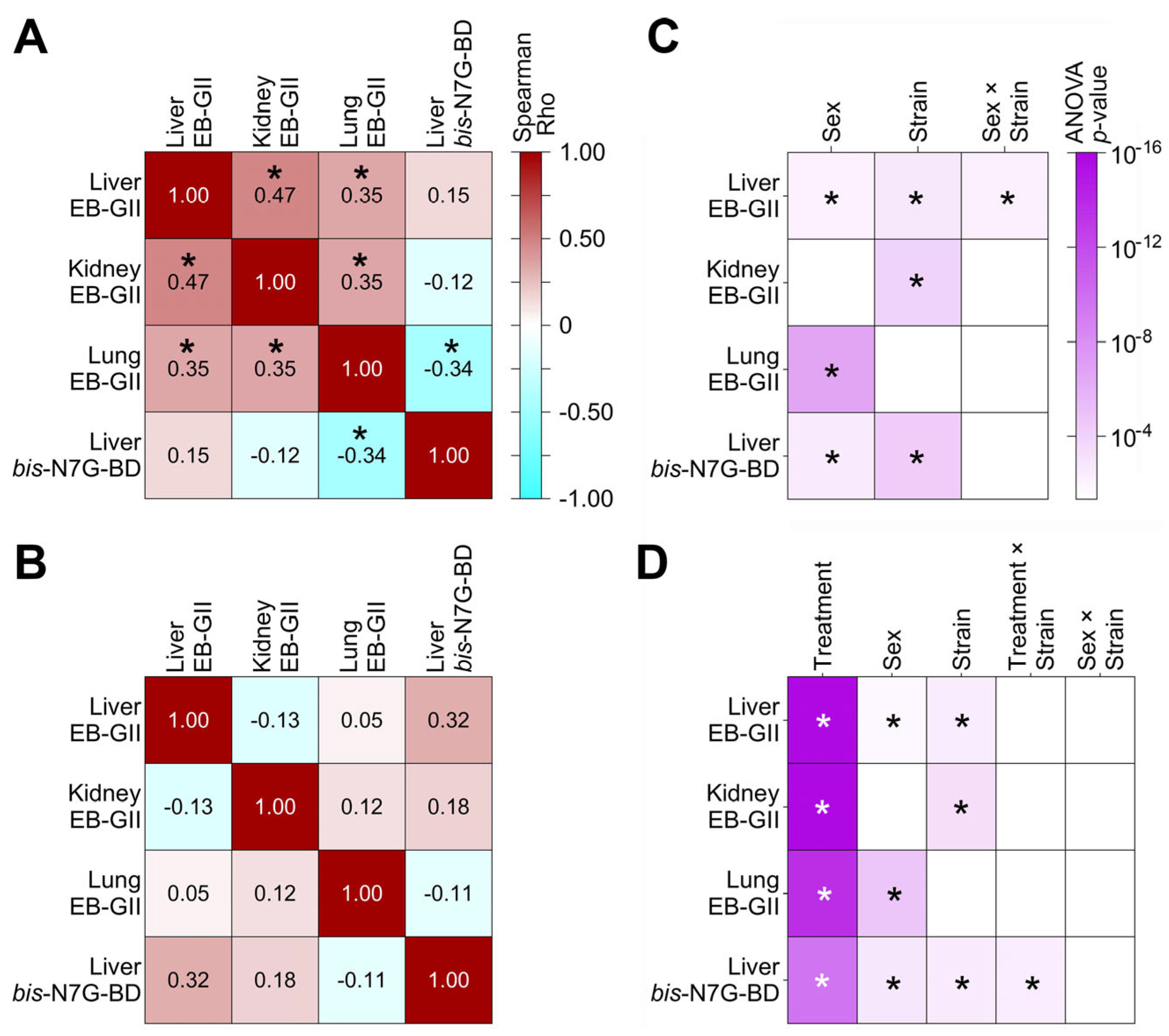 bis-N7G-BD were significantly negatively correlated with lung EB-GII and did not correlate with EB-GII in the liver or kidneys (