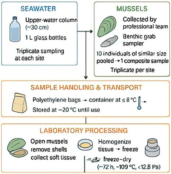- Mussels: Collected using a benthic grab sampler. To reduce variability (size, age, environmental conditions, and health status), 10 mussels of a similar size were pooled per sample, resulting in 30 composite samples per month.