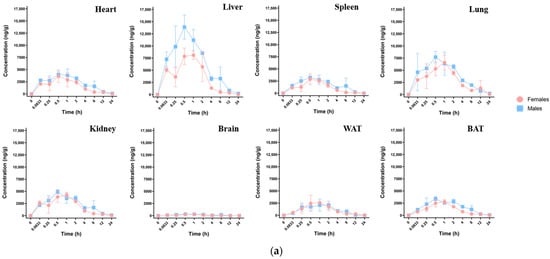 After oral exposure in mice, HFPO-DA was detected in eight different tissues. As illustrated in Figure 3a, the concentration-time distribution curves varied across different tissues. The absorption and distribution processes within each tissue type are shown in Table 7. HFPO-DA was detected in all tissues 0.0833 h after exposure, with Tmax ranging from 0.5 to 1 h across different tissues, indicating the rapid and widespread distribution of HFPO-DA within the mouse body. The Cmax (ng·g−1) for each tissue is shown in Figure 3b and was as follows: liver > lung > kidney > heart > spleen > brown fat > white fat > brain. The concentration in liver tissue was significantly higher than in other tissues. The concentrations in brown fat and white fat tissue were slightly lower than those in the heart and spleen, indicating that HFPO-DA has good lipophilicity. Despite its low concentration in the brain—approximately 1/40 of that found in the liver—its presence demonstrated that HFPO-DA could traverse the blood–brain barrier. The T1/2 in most tissues ranged from 3.5 to 4.8 h, with faster clearance observed in the spleen (2.7 h) and white fat (1.9 h). The tissue AUC0-t (h·ng·g−1) for HFPO-DA was as follows: liver > lung > kidney > heart > spleen > brown fat > white fat > brain, as shown in Figure 3d. The mean residence time (MRT0-t, h·ng·g−1) was as follows: lung > heart > kidney > brown fat > spleen > liver > white fat > brain. Males and females exhibited differences in tissue HFPO-DA concentrations. Males had lower Tmax values than females in the liver, lungs, kidneys, brain, and brown fat, with HFPO-DA concentrations peaking faster in males. Additionally, males generally had higher Cmax, T1/2, and AUC0-t values, as shown in Table 7, suggesting that HFPO-DA may have a more pronounced toxic effect on male mice.