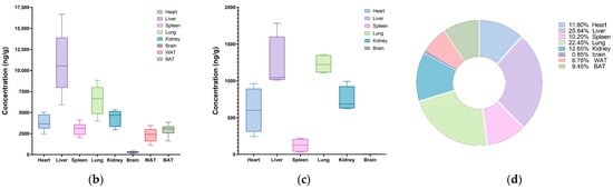 The methodological validation results for heart, liver, spleen, lung, kidney, brain, and adipose tissue are presented in Tables S1–S5. The method exhibited high specificity, excellent extraction recovery, and stability, with matrix effects effectively managed. Thus, it met the requirements for the quantitative analysis of biological samples.