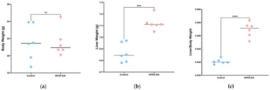 Effect of HFPO-DA on mouse liver after 16 d of continuous exposure at 3 mg·kg−1. The control group was administered pure water. (a) Body weight; (b) liver weight; (c) liver-to-body weight ratio. *** p < 0.001, **** p < 0.0001 compared with the control.