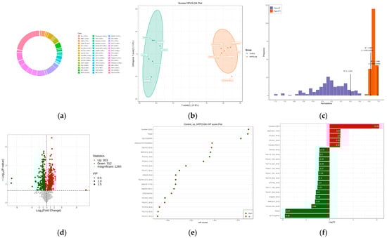Liver lipidome after 16 d of continuous exposure to 3 mg·kg−1 HFPO-DA: (a) circular diagram of lipid subclass composition; (b) OPLS-DA analysis of control vs. HFPO-DA; (c) OPLS-DA verification in control vs. HFPO-DA; (d) volcano plot of differentially expressed lipids in control vs. HFPO-DA; (e) analysis of differentially expressed lipid VIP values in control vs. HFPO-DA; (f) difference multiple analysis in control vs. HFPO-DA. Red indicates lipids that increased significantly; green indicates lipids that decreased significantly; gray dots represent lipids that did not change significantly.