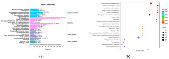 KEGG enrichment analysis indicated that the differentially expressed lipid metabolites were mainly associated with glycerophospholipid metabolism, glycerolipid metabolism, arachidonic acid metabolism, cholesterol metabolism, and fatty acid degradation. The classification of differentially expressed lipids was based on pathway types in the KEGG database. Figure 6a shows the enrichment pathways of differentially expressed lipids that accounted for more than 10% of all differentially expressed lipids. Among these, glycerophospholipid metabolism had 275 significantly differentially expressed lipid metabolites, accounting for 65.01% of all differentially expressed lipids; retrograde endocannabinoid signaling had 152 lipid metabolites, accounting for 35.93%; choline metabolism in cancer had 135 lipid metabolites, accounting for 31.91%; glycerolipid metabolism had 124 lipid metabolites, accounting for 29.31%; fat digestion and absorption had 114 lipid metabolites, accounting for 26.95%. The enrichment analysis of differentially expressed lipids is shown in Figure 6b, revealing significant differences in the glycerophospholipid metabolism, choline metabolism in cancer, arachidonic acid metabolism, and retrograde endocannabinoid signaling pathways (p < 0.05).