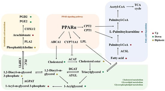 The mechanism by which HFPO-DA causes liver damage remains unclear. Transcriptome analysis revealed that short-chain PFAS are significantly enriched in fatty acid metabolism and β-oxidation pathways, with the expression of related genes being upregulated [17]. The detection of HFPO-DA revealed a significant enrichment of the PPARα signaling pathway in both the gene expression profiles of male neonatal mouse livers and the transcriptome analysis of liver cells exposed in vitro [18,19,20]. The observed hepatotoxic effects to date are also broadly consistent with the activation of the PPARα pathway, such as increased liver weight, hepatomegaly, and increased cell proliferation [21,22,23]. However, some studies have shown that HFPO-DA increases triglyceride content in mouse liver and elevates triglycerides and cholesterol in neonatal mouse serum [24]. Other studies have found inconsistent triglyceride changes in serum and liver [25]. The PPARα signaling pathway is closely linked to lipid disorders in various diseases and may coordinate and promote the expression of many target genes involved in fatty acid metabolism [26,27,28,29]. Therefore, it is necessary to explore the mode of action of HFPO-DA from the perspective of lipid metabolism by analyzing its underlying mechanisms and relationship with the PPARα pathway.
