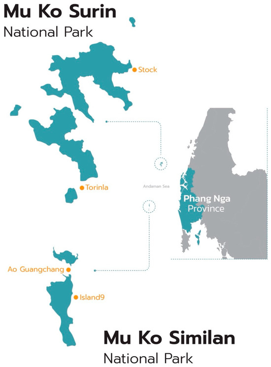 Similan Island and Surin Island, located in Mu Ko Similan National Park and Mu Ko Surin National Park, respectively, are islands in the Andaman Sea on the west coast of Southern Thailand (Figure 1).
