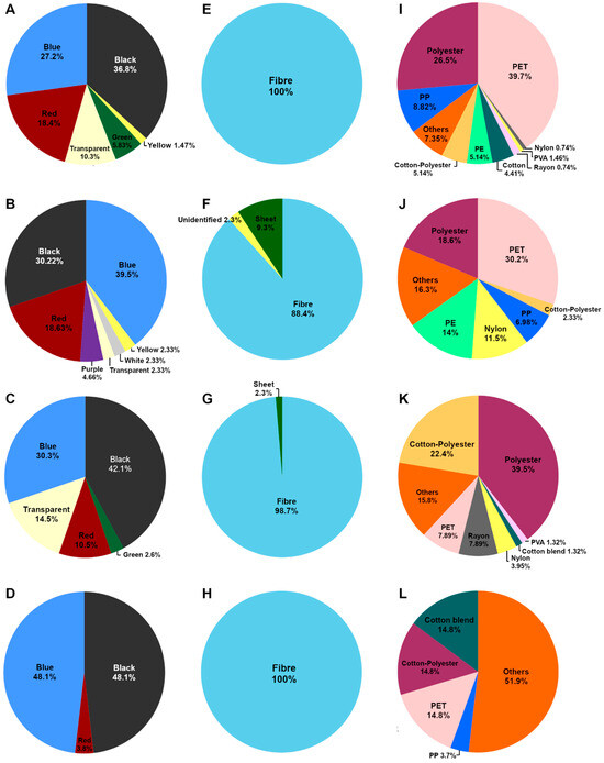 The physiochemical characteristics of microplastics in surface seawater. (A–D) Color, (E–H) shape, and (I–L) components of MPs found at Ao Guangchang (first row), Island9 (second row), Stock (third row), and Torinla (last row).