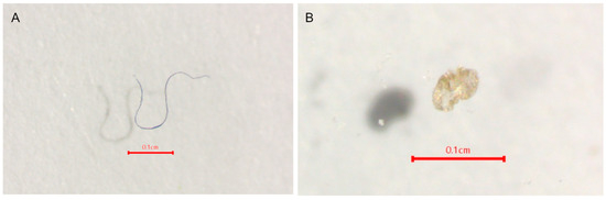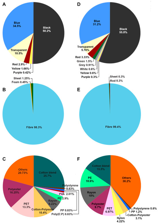 The main component of microplastics found in H. atra is a cotton blend (25.7%), followed by others (20.73%), polyester (16.25%), polyethylene terephthalate (PET) (13.3%), cotton–polyester blends (10.4%), and rayon (6.22%) (Figure 5C). The main component of microplastics found in H. edulis is other (38.2%), followed by cotton blends (15.5%), polyethylene (PE) (10.6%), rayon (10%), polyester (9.7%), polyethylene terephthalate (PET) (6.97%), and nylon (4.22%) (Figure 5F).