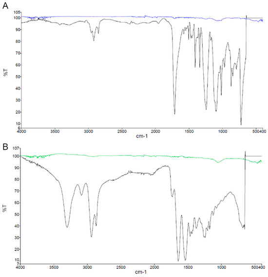 FTIR spectra for some samples for investigating components of microplastics found in seawater. (A) Polyethylene terephthalate (PET) and (B) nylon.