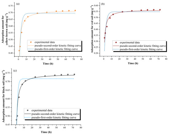 Adsorption kinetics fitting curves. (a) is yellow-brown soil, (b) is red soil, and (c) is black soil.
