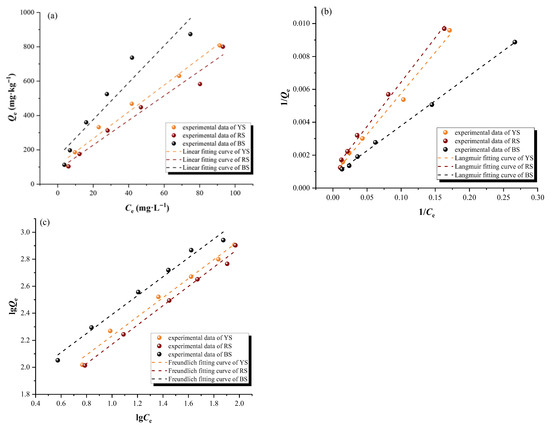 Isothermal adsorption fitting curves. (a) is the linear model, (b) is the Langmuir model, and (c) is the Freundlich model. NOTE: YS, RS, and BS represent yellow-brown soil, red soil, and black soil, respectively.