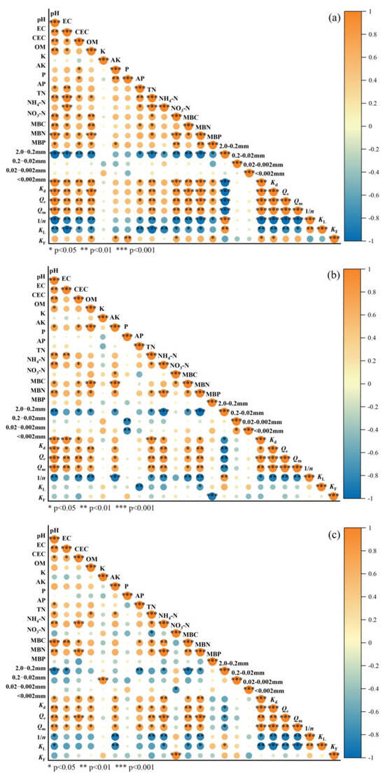 Heatmaps of Spearman correlation coefficients between the physicochemical and adsorption parameters for yellow-brown soil (a), red soil (b), and black soil (c). NOTE: pH, EC, CEC, OM, K, AK, P, AP, TN, NH4-N, NO3-N, MBC, MBN, and MBP represent pH value, electrical conductivity, cation exchange capacity, organic matter, total potassium, available potassium, total phosphorus, available phosphorus, total nitrogen, ammonium nitrogen, nitrate nitrogen, microbial biomass carbon, microbial biomass nitrogen, and microbial biomass phosphorus, respectively; 2.0–0.2 mm, 0.2–0.02 mm, 0.02–0.002 mm, <0.002 mm represent soil particle size distribution; and Kd, Qe, Qm, 1/n, KL, and KF represent adsorption affinity constant, equilibrium adsorption amount, maximal adsorption amount, nonlinear index, adsorption constant in the Langmuir isotherm model, and adsorption constant in the Freundlich isotherm model, respectively.