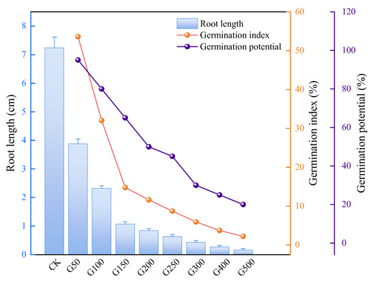 Results of the germination assay. NOTE: CK represents the control sample (no UDMH), G50, G100, G150, G200, G250, G300, G400, and G500 represent the UDMH addition into the germination bed of 50 mg·kg−1, 100 mg·kg−1, 150 mg·kg−1, 200 mg·kg−1, 250 mg·kg−1, 300 mg·kg−1, 400 mg·kg−1, and 500 mg·kg−1, respectively.