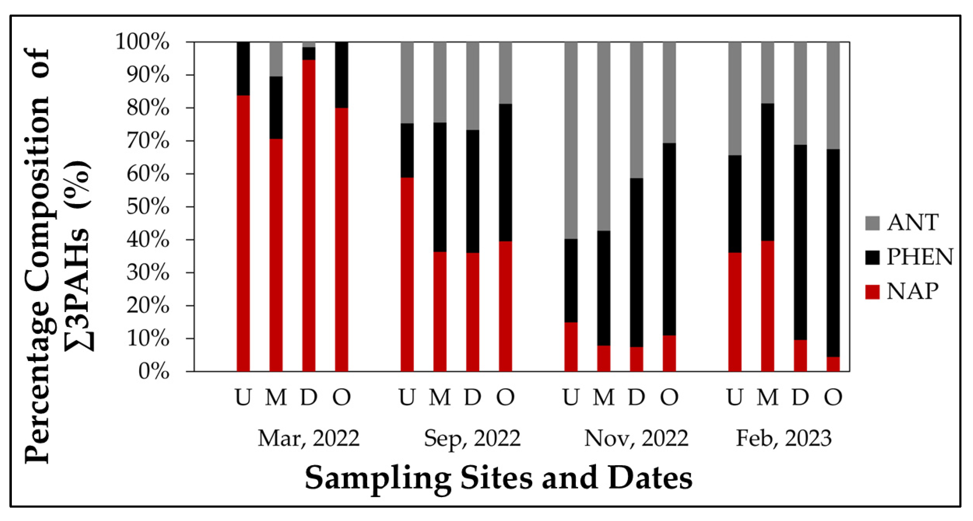 Date | Site | NAP Mean (ng/L) ± SD | Range | PHEN Mean (ng/L) ± SD | Range | ANT Mean (ng/L) ± SD | Range | Σ3PAHs (ng/L) |