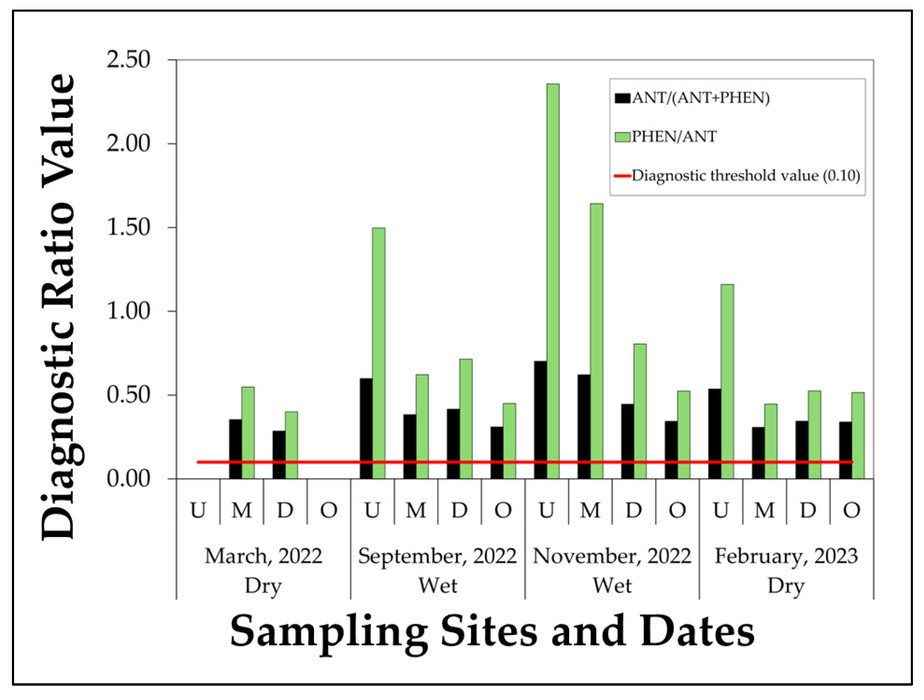 - Oyo-Ita, I.; Nkom, P.Y.; Ugim, S.U.; Bassey, F.I.; Oyo-Ita, O.E. Seasonal Changes of PAHs in Water and Suspended Particulate Matter from Cross River Estuary, SE Nigeria in Response to Human-Induced Activity and Hydrological Cycle. Polycycl. Aromat. Compd. 2022, 42, 5456–5473. [Google Scholar] [CrossRef]