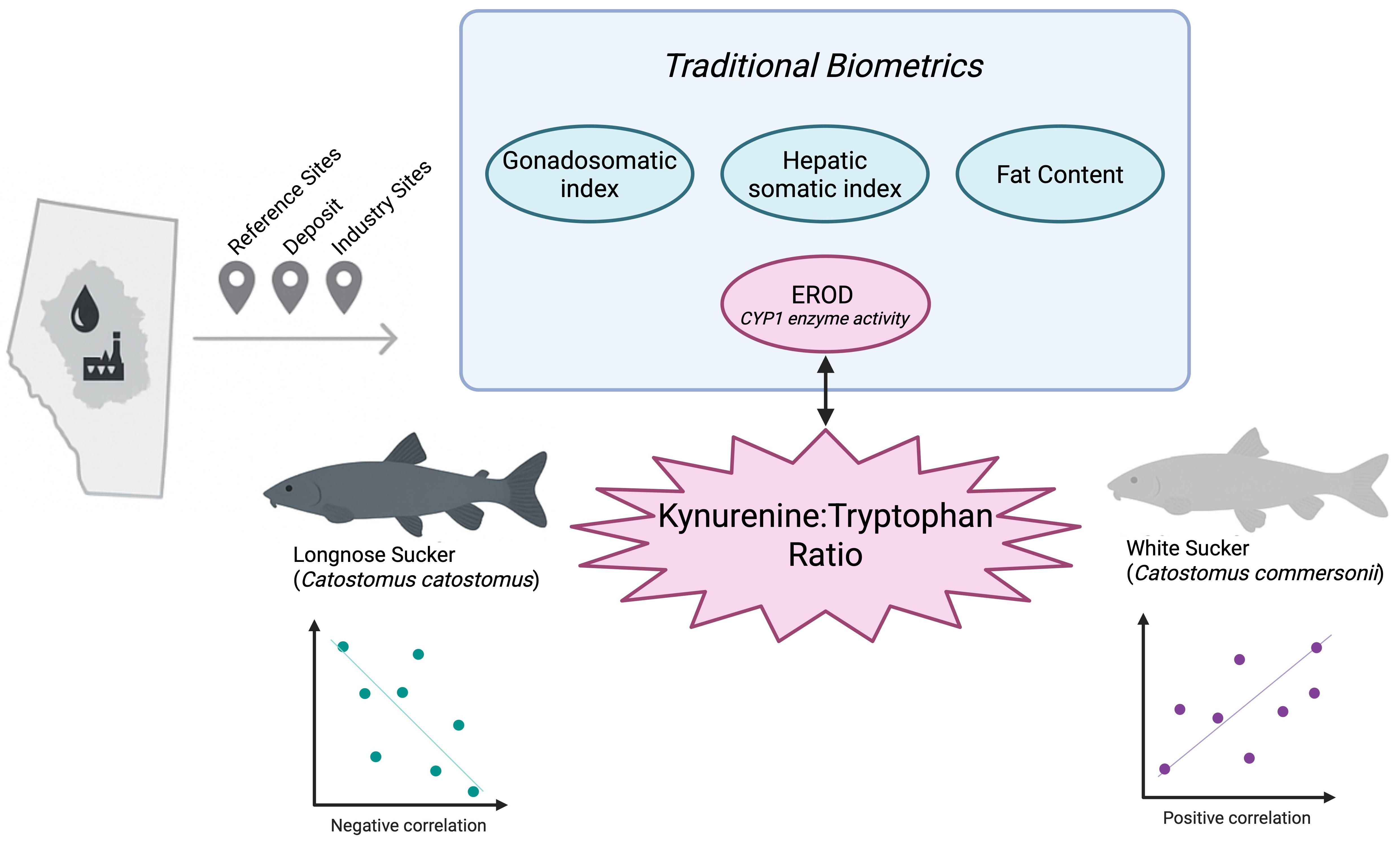Jamshed L, Debnath A, Marie-Lucas A, Tomy T, Tomy GT, Arciszewski TJ, McMaster ME, Holloway AC. Assessing the Kynurenine–Tryptophan Ratio (KTR) and CYP1 Activity in Longnose (Catostomus catostomus) and White Suckers (Catostomus commersonii) Exposed to Petroleum-Derived Contaminants from the Alberta Oil Sands Region. Toxics. 2025; 13(10):862. https://doi.org/10.3390/toxics13100862