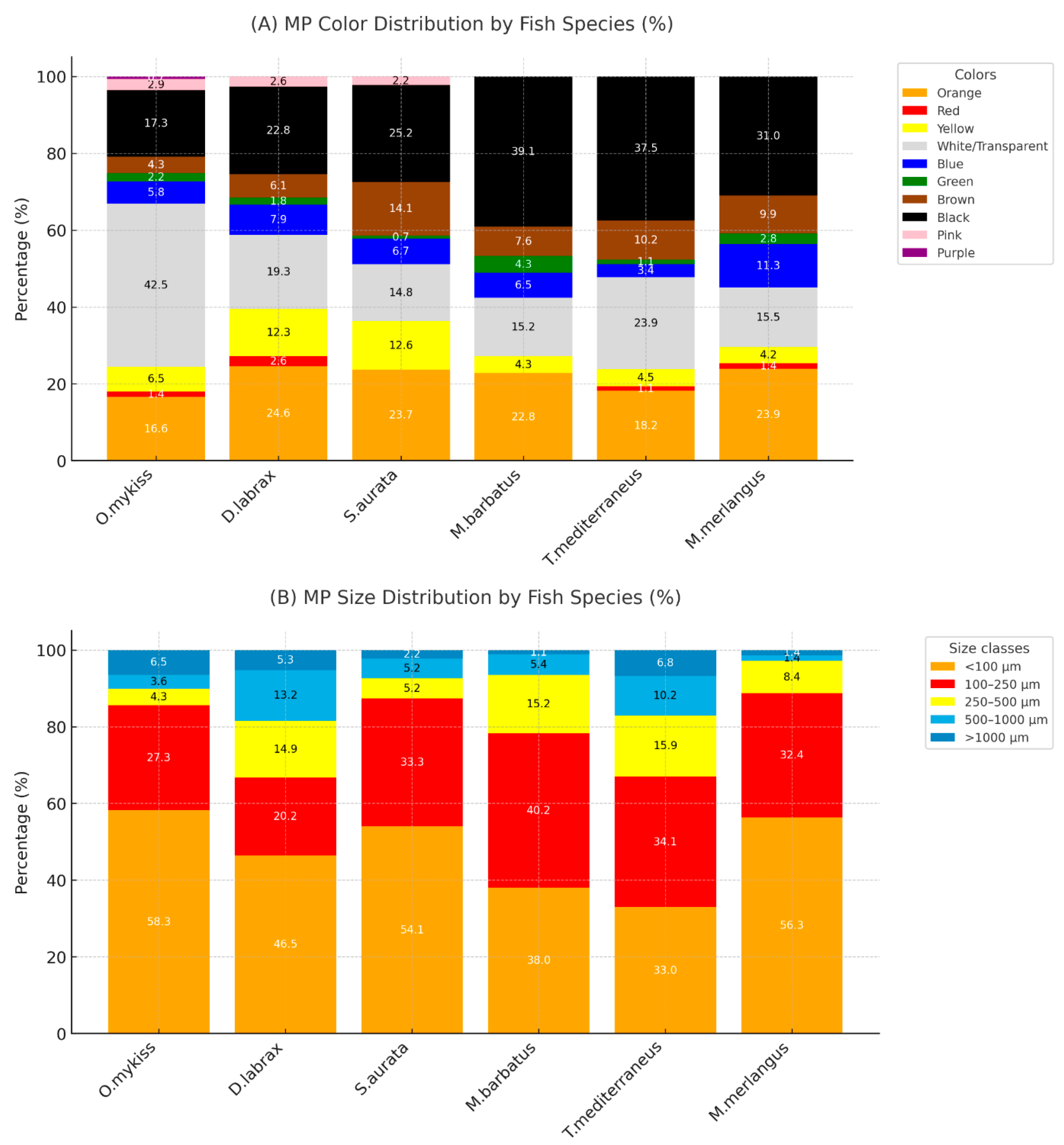 Species | Oncorhynchus mykiss | Dicentrarchus labrax | Sparus aurata | Mullus barbatus | Trachurus mediterraneus | Merlangius merlangus |