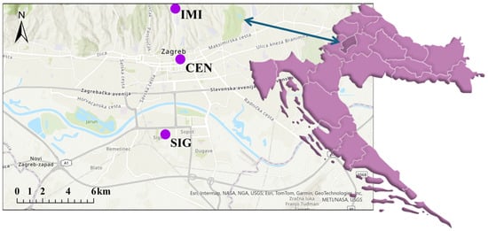 Site locations. Figure was made using ArcGIS Pro (version 3.2.0) and Adobe Illustrator (version 29.5.1). IMI (altitude 116 m a.s.l., 45°50′7′′ N, longitude 15°58′42′′ E); SIG (altitude 116 m a.s.l., latitude 45°46′25′′ N, longitude 15°59′04′′ E), CEN (altitude 113 m a.s.l., 45°48′37′′ N, longitude 15°59′4′′ E).
