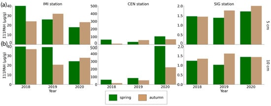 Across sites, Σ11PAH concentrations showed both seasonal and depth-related differences (Figure 2). At CEN, values were higher at 10 cm than at 5 cm for most seasons. At IMI, seasonal means were more balanced, with slightly higher values at 10 cm in both spring and autumn, but no major depth effect was observed. At SIG, concentrations remained uniformly low regardless of depth or season, with only minor variation between 5 cm and 10 cm layers.
