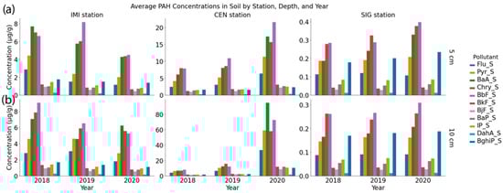 Annual variation (x-axis, 2018–2020) of PAH concentrations in soil at depths (a) 0–5 cm; (b) 5–10 cm at monitoring sites IMI, CEN, and SIG, in µg/g, mean for both seasons.