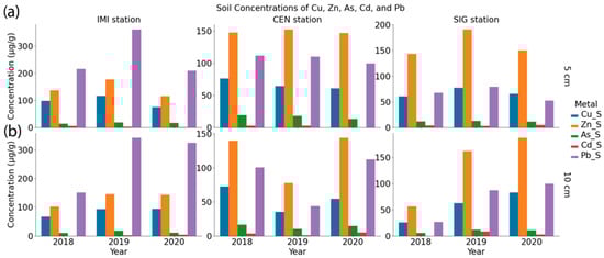 Annual variation (x-axis, 2018–2020) of metal concentrations in soil at depths (a) 0–5 cm; (b) 5–10 cm at monitoring sites IMI, CEN, and SIG, in µg/g, mean for both seasons.