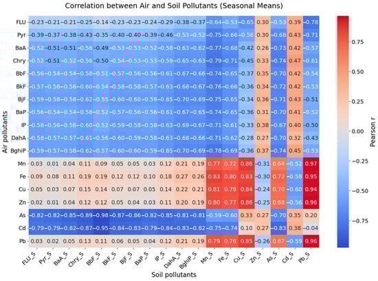 Correlation heatmap between air and soil pollutants (air: seasonal mean concentrations; soil: mean across both seasons and depths).