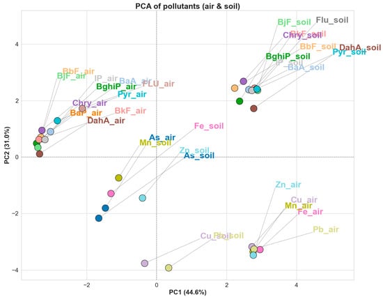 To explore the relationships between pollutant concentrations in air and soil, a modified PCA was performed on a transposed dataset, where pollutants were treated as observations. In this approach, the average concentrations of PAHs and trace metals in both air and soil were used to construct a matrix, where each row corresponds to a pollutant and each column represents a sampling event. This PCA (Figure 6) illustrates how individual pollutants behave across various environmental media and sampling conditions, enabling the visual clustering of pollutants that exhibit similar environmental distribution patterns. Unlike conventional PCA, which groups similar samples, this approach enables the direct comparison of air–soil pairs of the same compound, thereby explaining their environmental stability, partitioning behavior, and potential common emission sources.