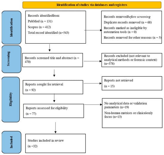This narrative review systematically identifies and compares analytical workflows for the direct quantification of diamorphine (DIM) and its metabolites in biological specimens. A structured literature search was conducted in PubMed and Scopus covering the period from January 1980 to July 2025, using Boolean combinations of the keywords “heroin,” “diamorphine,” “6-MAM,” “morphine,” and “glucuronide.”. From an initial pool of 543 records (PubMed n = 131; Scopus n = 412), duplicates and irrelevant studies were removed. Articles were excluded if they focused exclusively on environmental or non-biological matrices, lacked sufficient validation data, or described methods quantifying only morphine or its glucuronide conjugates without direct DIM measurement. After removal of duplicates and irrelevant records, 470 titles and abstracts were screened, of which 378 were excluded. Ninety-two full texts were sought for retrieval, with 15 not retrieved. Of the 77 reports assessed for eligibility, 32 studies met the inclusion criteria and were included in the review, as indicated in Figure 1.