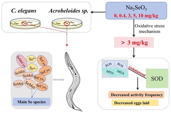 - Li, W.H.; Ju, Y.R.; Liao, C.M.; Liao, V.H.C. Assessment of Selenium toxicity on the life cycle of Caenorhabditis elegans. Ecotoxicology 2014, 23, 1245–1253. [Google Scholar] [CrossRef]