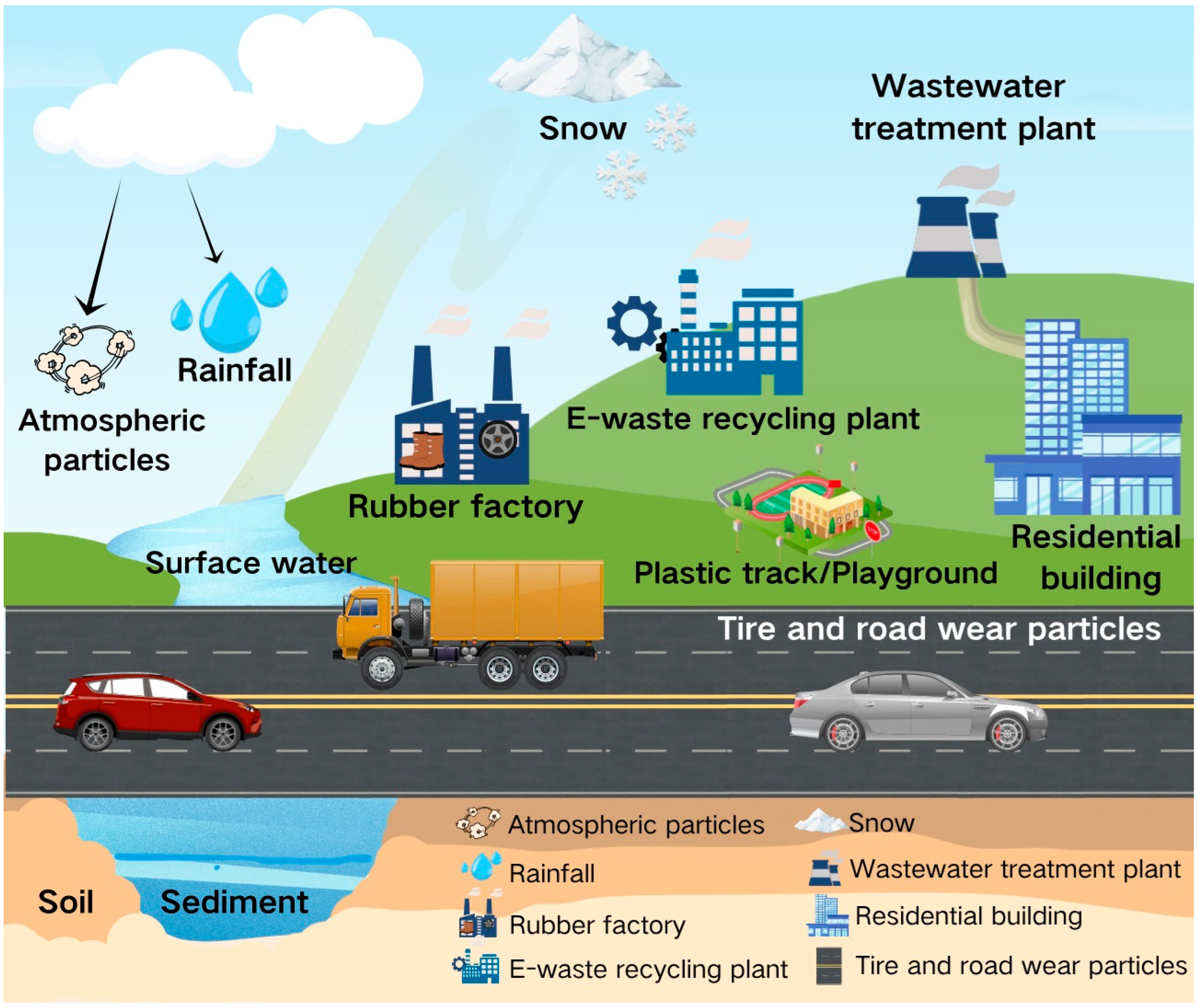 - Thodhal Yoganandham, S.; Daeho, K.; Heewon, J.; Shen, K.; Jeon, J. Unveiling the environmental impact of tire wear particles and the associated contaminants: A comprehensive review of environmental and health risk. J. Hazard. Mater. 2024, 480, 136155. [Google Scholar] [CrossRef] [PubMed]