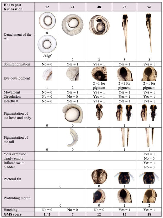Extended General Morphology Score (Extended GMS). Two corrections were made to the extended GMS scoring system published by Beekhuijzen et al. []: (1) At 24 h after exposure, a heartbeat can be observed but no circulation is visible. (2) At 96 h after exposure, an additional observation was included: an inflated swim bladder (yes = 1, no = 0). Consequently, the maximum score at this time point increased to 18 points.
