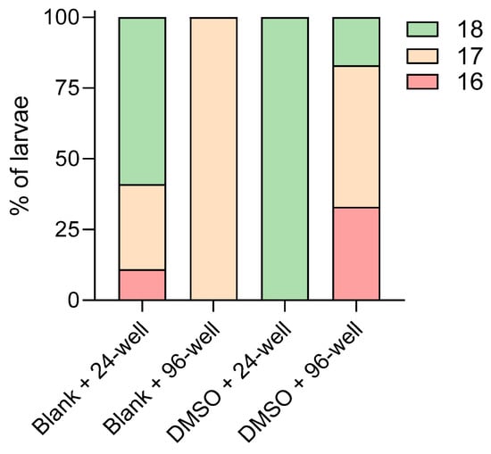 The effect of temperature on development at the end of exposure was more pronounced in the blank control than in the 0.5% v/v DMSO control (Scheme 2). In the blank control at 26 °C, 16% of larvae showed a developmental score of 16, a score of 17 was reached by 34% of larvae, and 50% reached a score of 18. A shift towards higher developmental scores was observed in the blank control at 28 °C (37.5% and 62.5%, with scores of 17 and 18, respectively). In the 0.5% v/v DMSO control, differences between temperatures were less obvious: at 26 °C, 17%, 17%, and 67%, they showed a developmental score of 16, 17, and 18, respectively. At 28 °C, the distribution was 17%, 33%, and 50%, respectively.