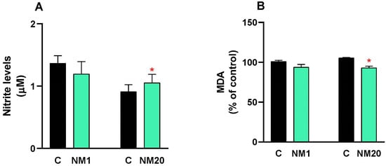 Evaluation of oxidative stress mediators (NO and MDA) in plasma from chickens exposed to a single oral dose of 2000 mg/kg b.w. of a natural mixture of thymol/eucalyptol. NO (A) and MDA (B) values are expressed as mean ± SD. Statistical differences between the treated groups (NM1 and NM20, gray bar) and the controls (C, black bar) were evaluated using Student’s t-test (* p ≤ 0.05).