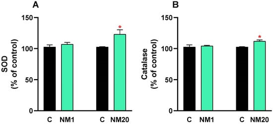 A dose of 2000 mg/kg body weight of the natural thymol–eucalyptol mixture was administered orally to broiler chickens, and after 14 days, the antioxidant enzymes SOD and catalase were analyzed in plasma. The SOD (Figure 2A) and catalase (Figure 2B) values in NM1 chickens did not change because of exposure to the natural mixture; while in NM20 chickens, there were significant increases in SOD (23%, * p ≤ 0.05) and catalase (11%, * p ≤ 0.05) activities compared to the control.