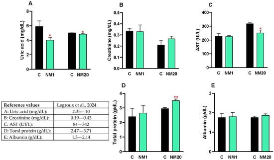 Blood plasma biochemical profile of chickens exposed to a single oral dose of 2000 mg/kg b.w. of a natural mixture of thymol/eucalyptol. The values for uric acid (A), creatinine (B), AST (C), total protein (D) and albumin (E) are expressed as mean ± SD. Statistical differences between the treated groups (NM1 and NM20, gray bar) and the controls (C, black bar) were evaluated using Student’s t-test (* p ≤ 0.05; ** p ≤ 0.01). The reference values are indicated in the table included in the figure [].