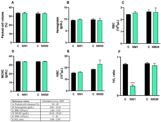 This study evaluated hematological parameters (packed cell volume, hemoglobin, red blood cells, MCHC, white blood cells, and H/L ratio) in NM1, NM20, and control chickens. The values for packed cell volume (Figure 4A), hemoglobin (Figure 4B), red blood cells (Figure 4C), MCHC (Figure 4D), and white blood cells (Figure 4E) did not change in NM1 and NM20 chickens compared to the control group. H/L ratio values decreased significantly in the NM1 groups (70%, *** p ≤ 0.001) compared to the control (Figure 4F).