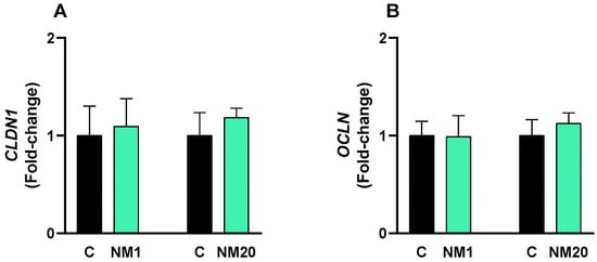qPCR assay in the intestines of chickens administered a single oral dose of 2000 mg/kg body weight of a natural mixture of thymol/eucalyptol. Fold-change values for claudin (A) and occludin (B) are expressed as mean ± SD. Statistical differences between the treated groups (NM1 and NM20, gray bar) and the controls (C, black bar) were evaluated using Student’s t-test.