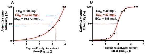 Cytotoxicity induced by thymol/eucalyptol extract (1–10,000 mg/L) on Artemia salina (A) and Daphnia magna (B) after 24 h incubation period. Cytotoxicity was determined by viability reduction, and (%) dose–response curve was used to obtain the IC20,50,80 values. Data are presented as % of three repetitions.