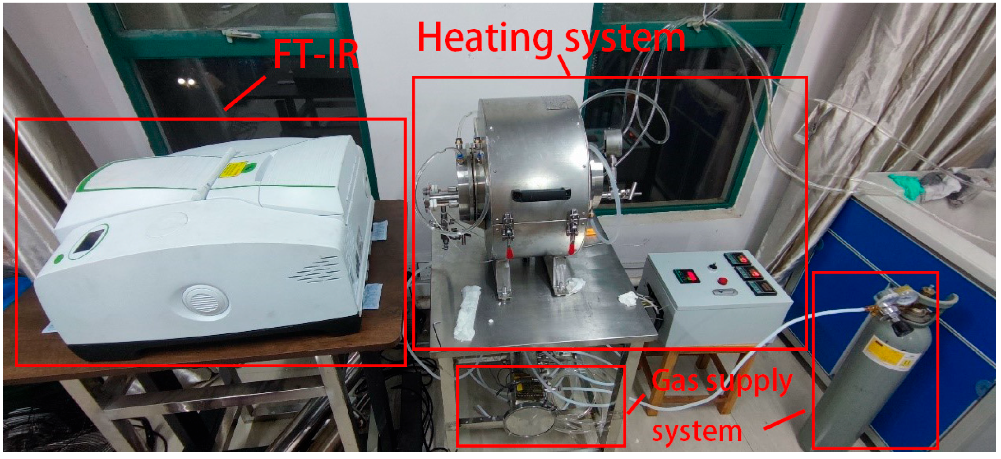 High-temperature spectral testing of individual and mixed gases was conducted using a dedicated platform. The study focused on four combustion-derived gases—CO2, SO2, NO, and NO2—generated from low-carbon chemicals (carbon disulfide and acetonitrile). The purity of gases used in the experiment was as follows: CO2 99.99%, SO2 99.9%, NO 99.5%, NO2 99.5%, N2 99.999%. The calibration accuracy of MFC (model: Alicat MCR-500, Alicat Scientific, Tucson, AZ, USA) is ±0.5% FS, with a calibration cycle of 3 months. The pipeline material is 316 stainless steel (corrosion-resistant, to avoid gas adsorption). The gas flow rate is controlled at 500 sccm, the mixing volume of the gas chamber is 500 mL, and the residence time is about 10 s (to ensure uniform gas mixing). The humidity in N2 is measured to be <0.1 ppm by a dew point meter (model: Testo 645, Testo SE & Co., KGaA, Titisee-Neustadt, Germany), and the content of CO/CO2 in N2 is measured to be <0.1 ppm by gas chromatography (model: Agilent 7890A, Agilent Technologies, Inc., Santa Clara, CA, USA).
