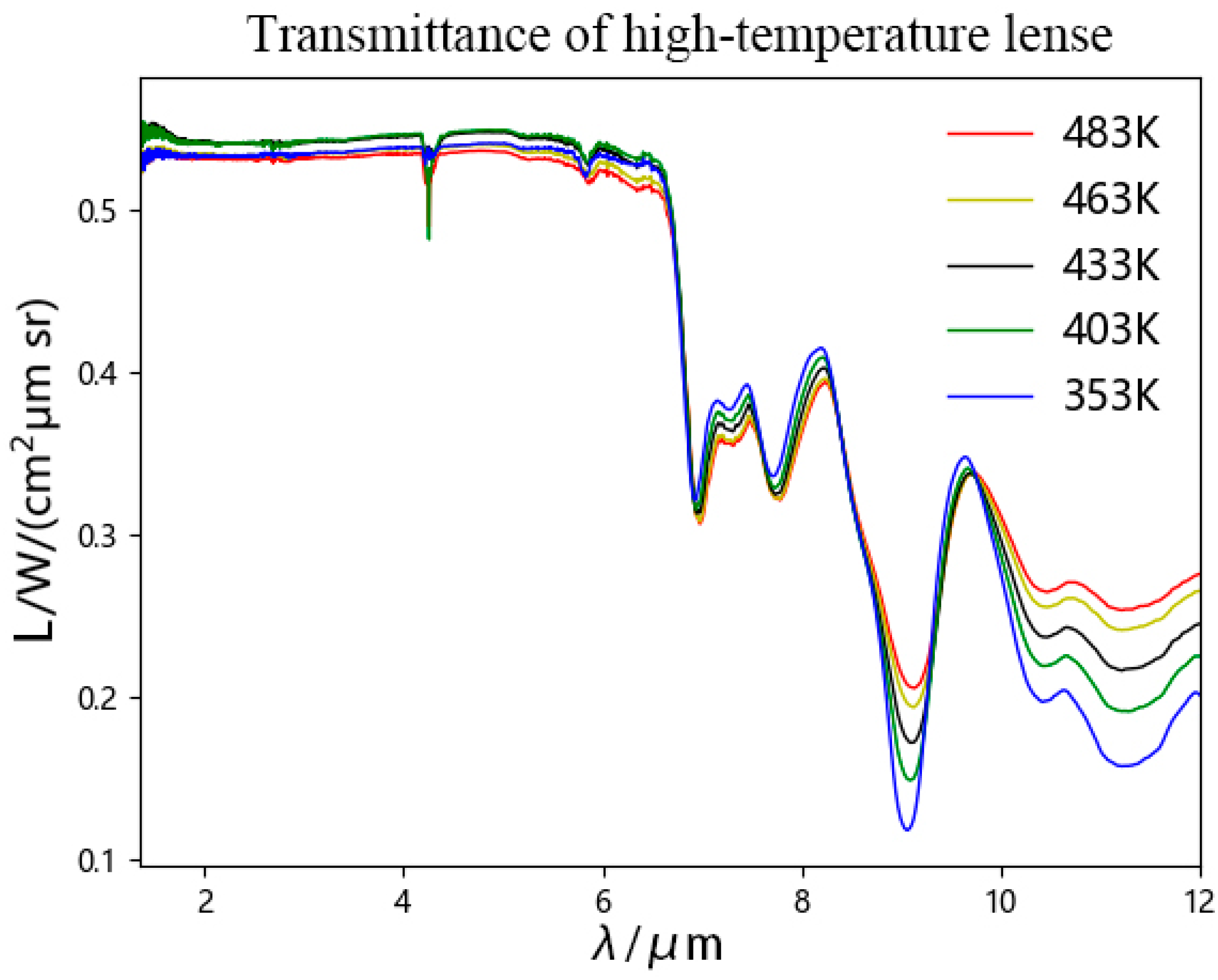 The experiment tested the transmittance of the lens within the temperature range of 353–483 K. The transmittance of the lens was calculated using Equations (1)–(3), as shown in Figure 2. The transmittance of the lens remained stable at around 0.535 in the 1.3 μm–6.6 μm wavelength range, and the temperature difference was not significant. There is a significant decrease in the wavelength range of 6.65 μm–6.95 μm, and the lens transmittance varies greatly at different temperatures between 8.6 μm–12 μm.