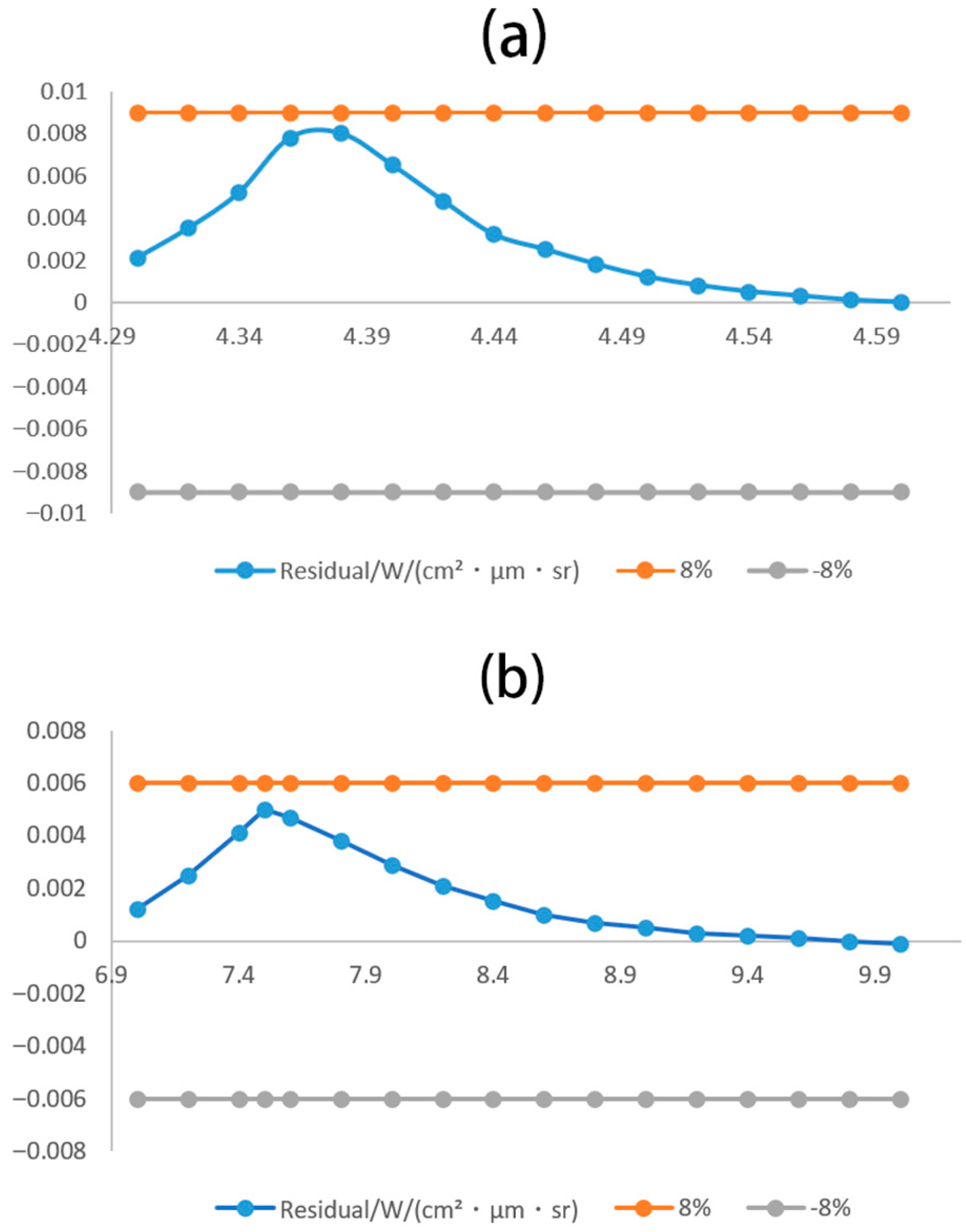 Figure 8. Quantitative residual plots ((a)—4.3–4.6 μm (CO2), (b)—7–10 μm (SO2); temperature—1023 K).