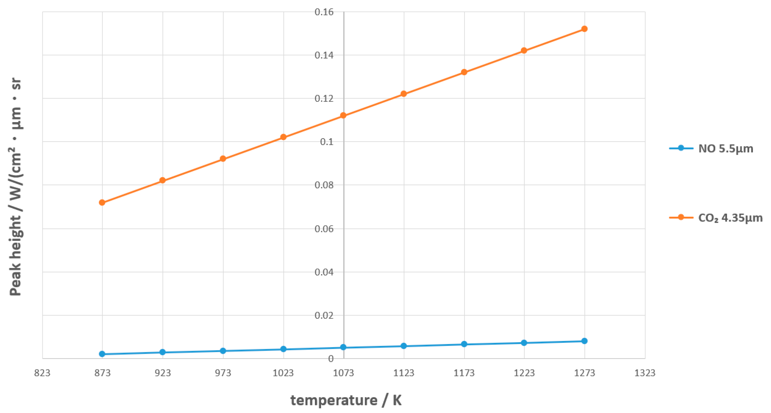 Spectral data for high-temperature gases were collected at 50 K intervals within the 773–1073 K range. To extrapolate radiation spectra across this temperature domain, the relationship between gas radiation and temperature was analyzed through spectral fitting. Unlike gases, the radiation intensity of solids and liquids increases with thermal excitation. Blackbody radiation depends solely on its intrinsic temperature.
