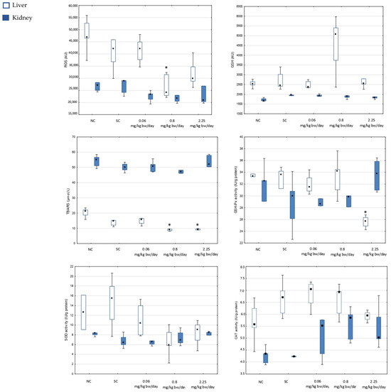 Results regarding the biochemical markers of oxidative stress measured in the liver and kidney of adult male Wistar rats treated orally for 28 days with imidacloprid applied at three doses, and in the corresponding controls (N = 5 rats per group). ROS—reactive oxygen species; GSH—glutathione; TBARS—thiobarbituric reactive substances; GSH-Px—glutathione peroxidase; SOD—superoxide dismutase; CAT—catalase. NC—negative control, SC—solvent control. The results are shown as median (square), 25th and 75th percentiles (box), and min–max range (whisker). Statistically significant values (set at p < 0.05; Kruskal–Wallis test) are as follows: *—vs. negative control.