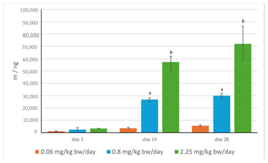 Urinary excretion of imidacloprid in 24 h urine samples of male Wistar rats treated orally for 28 consecutive days with three doses of imidacloprid, collected on days 1, 14, and 28 of treatment (N = 5 rats per group). The results are presented as means and ranges (error bars denote minimum and maximum values). Repeated-measures ANOVA with Bonferroni-corrected post hoc tests (p < 0.05): a—vs. day 1 at dose 0.8 mg/kg bw/day; b—vs. day 1 at dose 2.25 mg/kg bw/day.