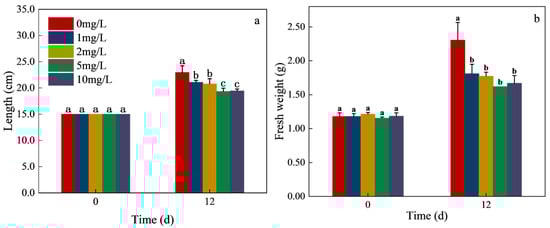 Effects of CIP concentrations on the length (a) and fresh weight (b) of H. verticillata after 12 days of exposure. The concentrations corresponding to different colors in the legends are 0 mg/L (control), 1 mg/L, 2 mg/L, 5 mg/L, and 10 mg/L, respectively. Error bars represent the mean ± standard deviation (n = 3). Different letters above the columns indicate significant differences (p < 0.05) between the control and experimental groups.